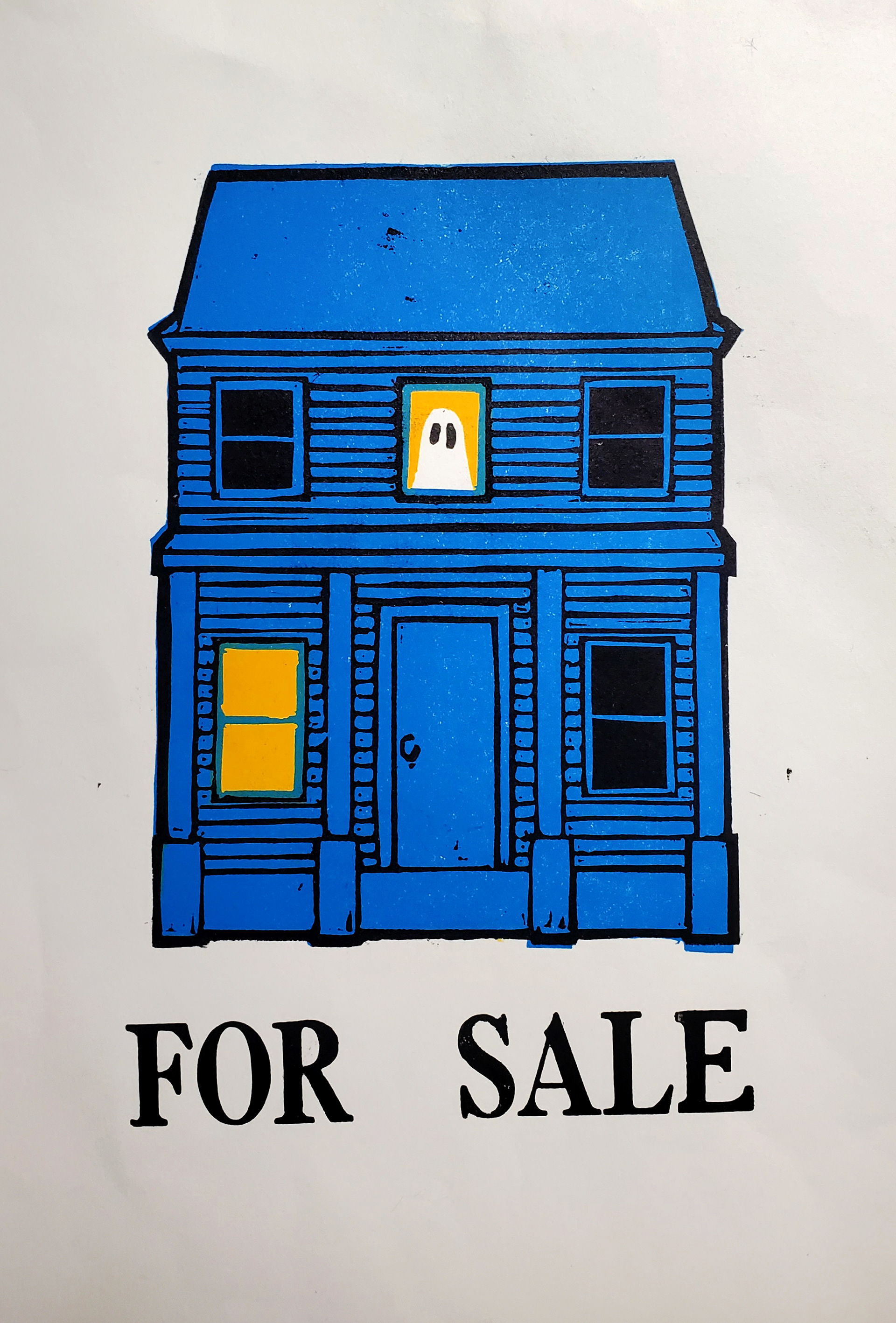 I made this piece in a printmaking class. I was asked to create a linocut print that had accompanying wood type. The image is comprised of three different color layers done with three different carved linoleum blocks. I chose to do a darker blue for the shadowed parts of the house and a brighter yellow for the lit-up windows to add to the cartoon-like style of the image. The text reading “for sale” was added to give the image context outside of simply being a haunted house.