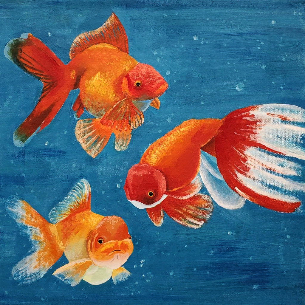 I made this piece in an introductory painting class. I was asked to create a 12-inch by 12-inch painting in both paint type and subject of choice. Working from different photographs, I collaged three different varieties of goldfish together on top of a blue background to create color contrast.