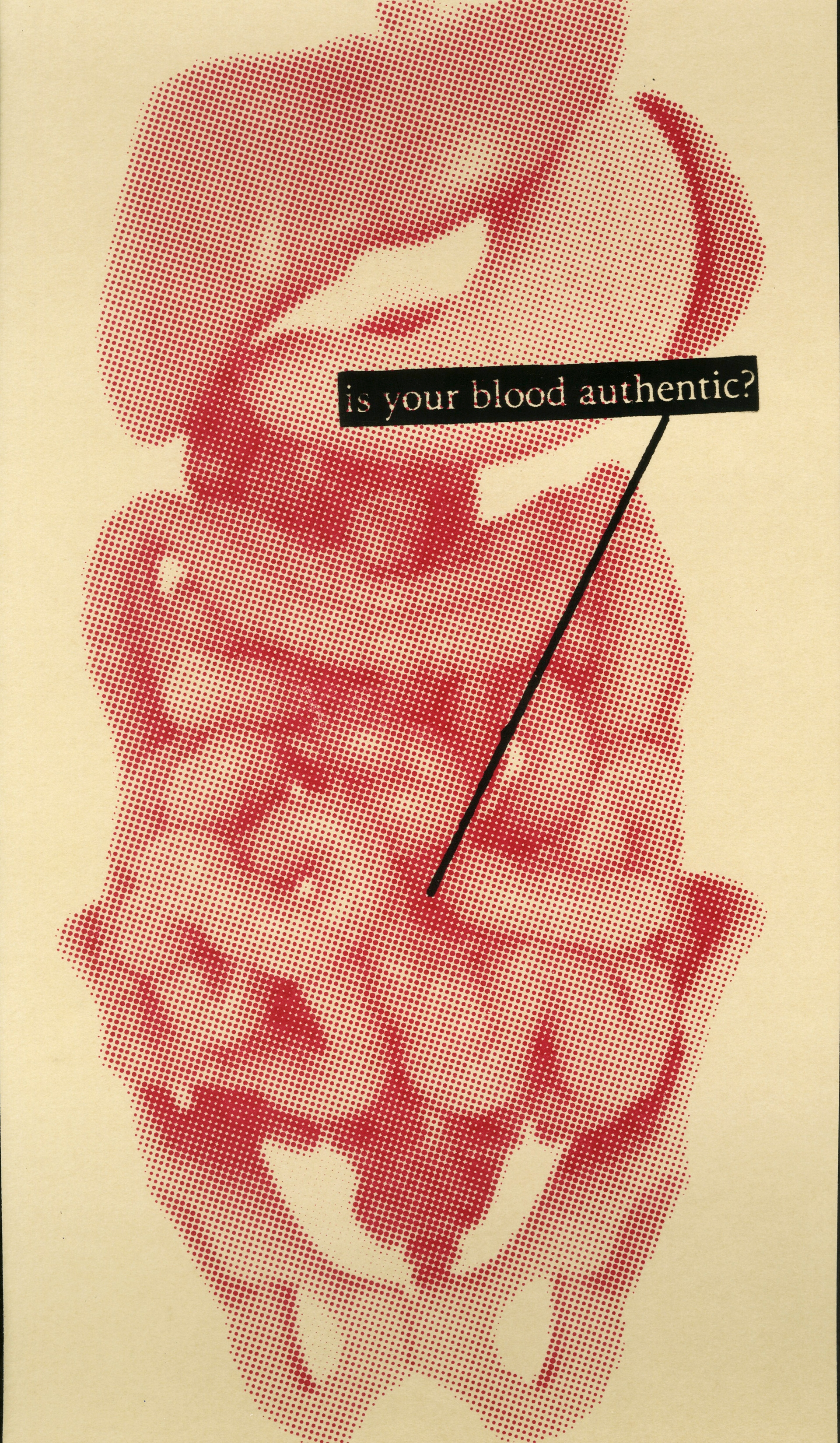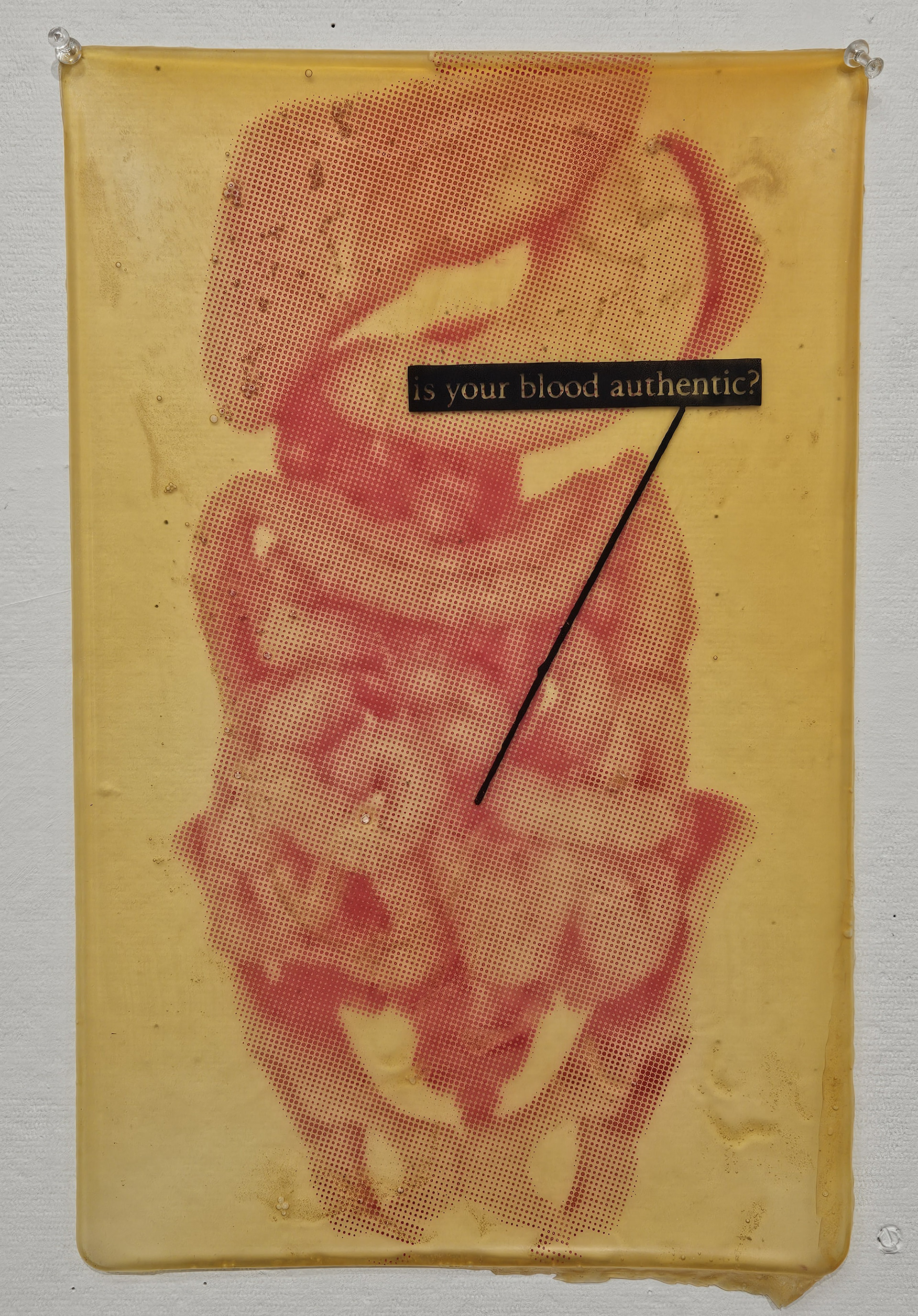 I created this piece for a screen printing class. We were asked to print an image onto a nonconventional piece of material. I chose this collaged image from a zine I made that combines human intestines and text that points to them, like in medical and scientific images, but instead of identifying what they are, it displays the phrase, "Is your blood authentic?" I printed this imageĀ as a two-layer image on a sheet of solidified liquid latex that mimics skin (left). I also printed it on toned paper (right).