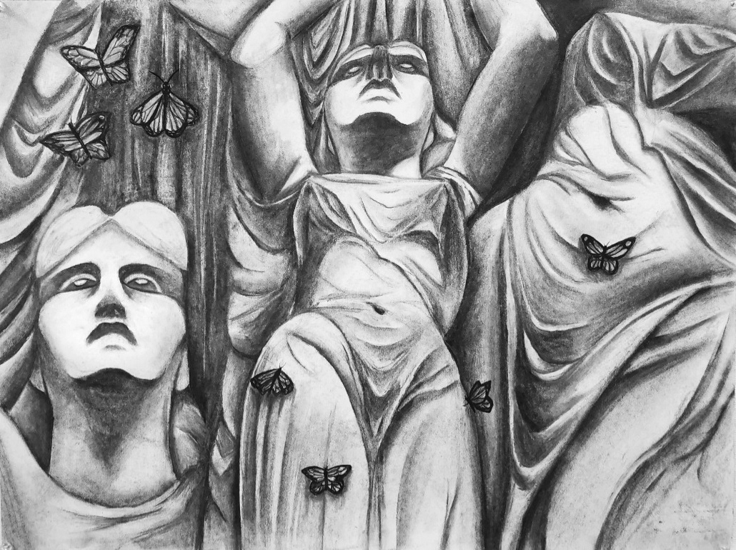 I made this piece in an observational drawing class. I was asked to create an 18-inch by 24-inch charcoal drawing with a subject matter of my choosing. Working from photographs, I drew different angles of Chauncey Bradley’s statue Undine Rising from the Waters. I thought the statue’s likeness would translate well to charcoal. I captured multiple angles of the statue to make the composition more dynamic. Finally, I added the butterflies to create visual interest.