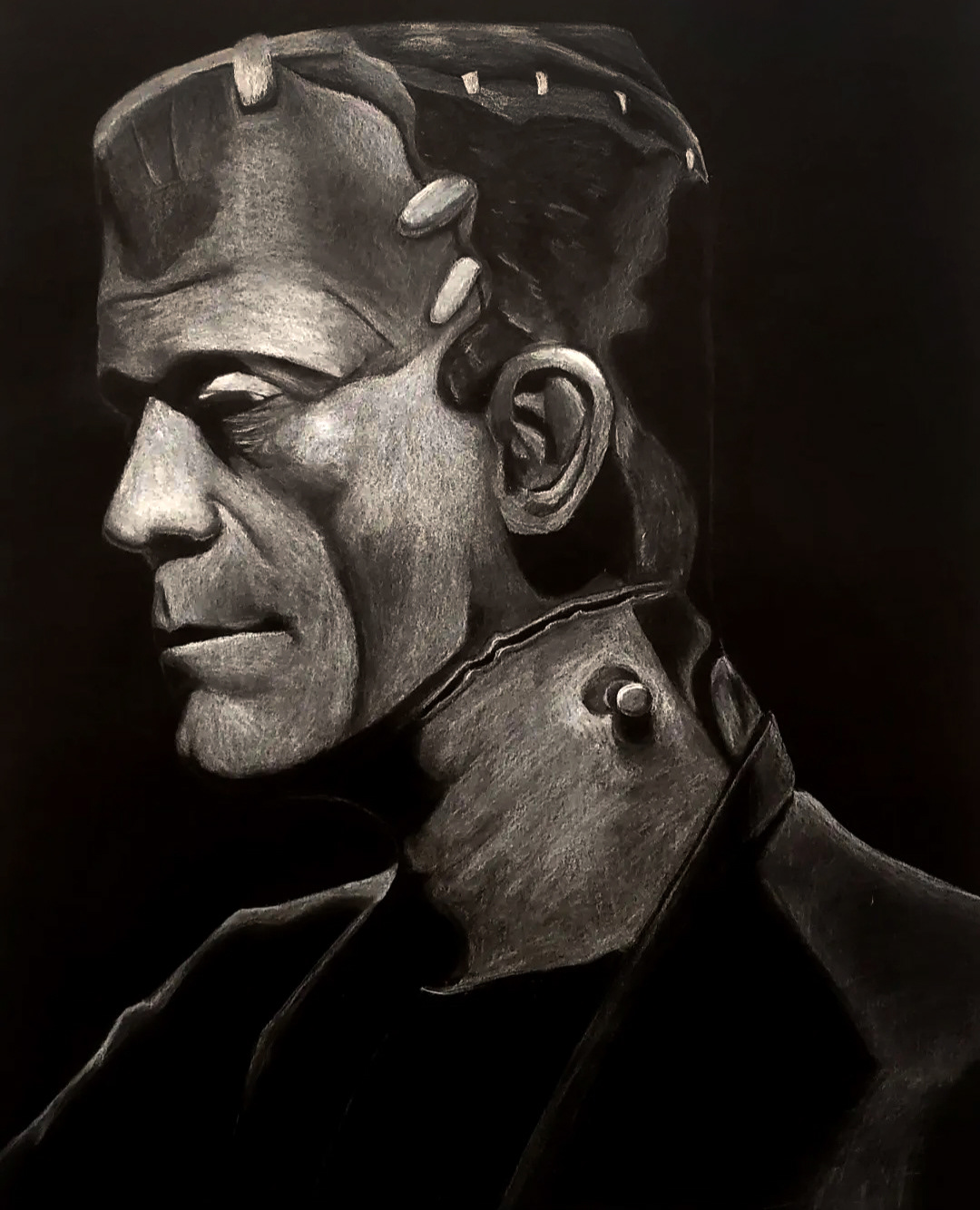 I made this piece in a figure drawing class. I was asked to create an 18-inch by 24-inch charcoal portrait from a reference of my choosing. Working from a photograph, I drew Frankenstein’s monster from James Whale’s 1931 film Frankenstein. Rather than a traditional black charcoal drawing on white paper, I chose to do white charcoal on black paper, as this is something I had been working with in class and thought would work well with the reference I chose.