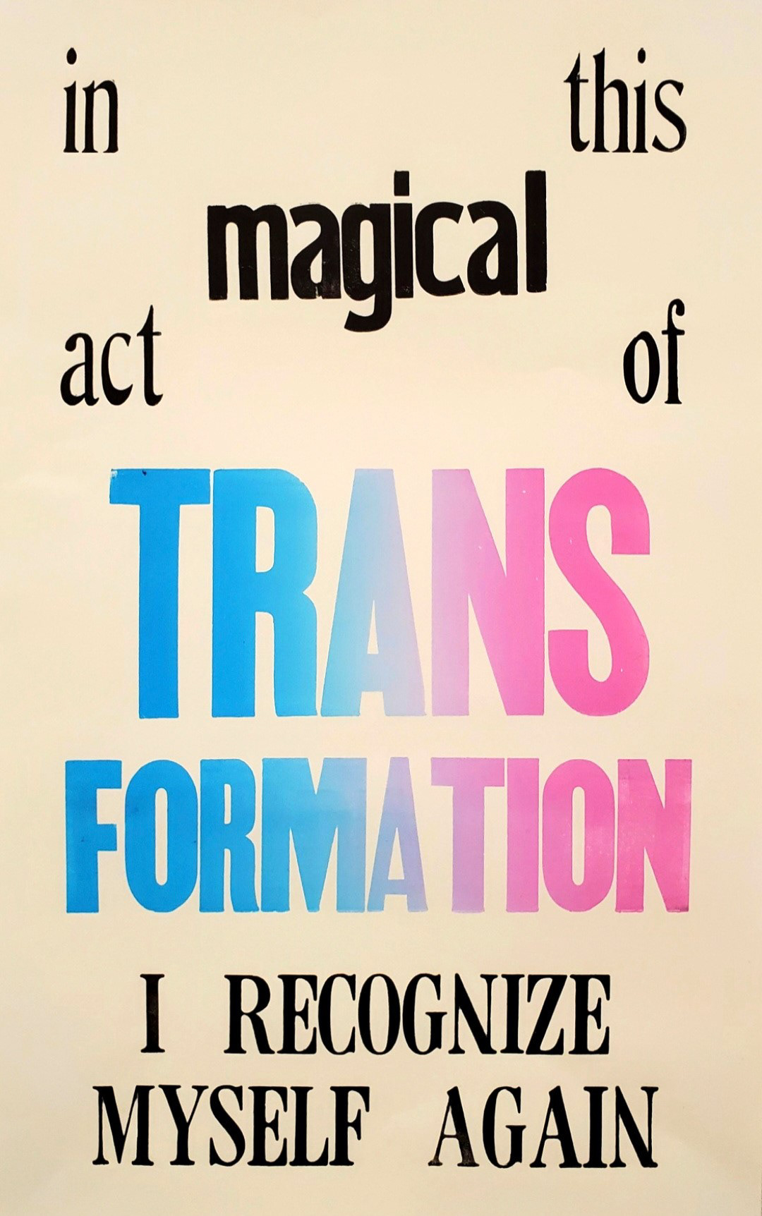 I made this piece in a printmaking class. I was asked to make a broadside with printed text via wood type. Broadsides tend to be used to share an important message, so I decided to print a quote that speaks to how I feel about my identity as a transgender person. “In this magical act of transformation I recognize myself again” is a quote of Susan Stryker’s from her performance essay My Words to Victor Frankenstein above the Village of Chamounix - Performing Transgender Rage. While most of the text is black, I chose to print the word “transformation” in light pink, light blue, and white, as these are the colors of the transgender flag. The mix of fonts and text size was done to give the piece stylization and visual interest.
