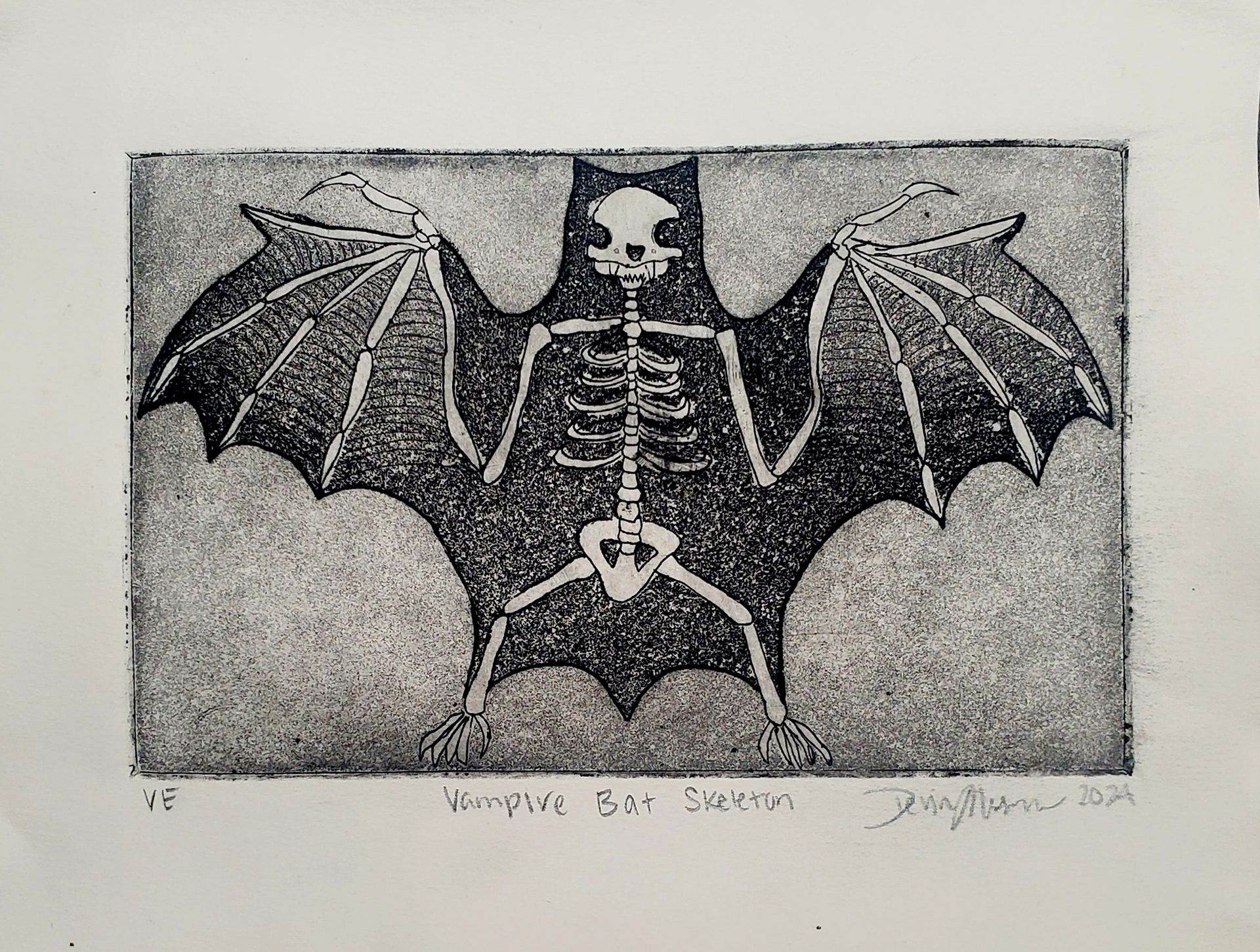 I made this piece in a printmaking class. I was asked to create a print with a 3-inch by 5-inch piece of zinc etched using the intilago printing process. To create an image with this process, you etch thin lines into the zinc, so I chose a design to which I could add lots of fine detail. Taking inspiration from detailed scientific drawings of animal anatomy, I created this print of a vampire bat skeleton.